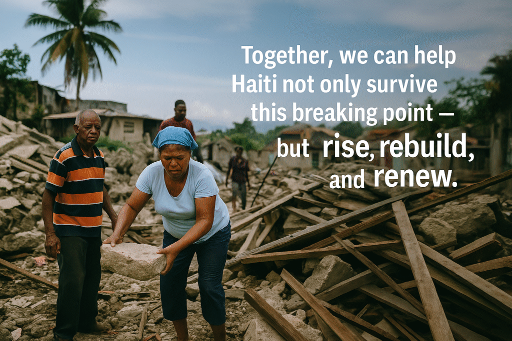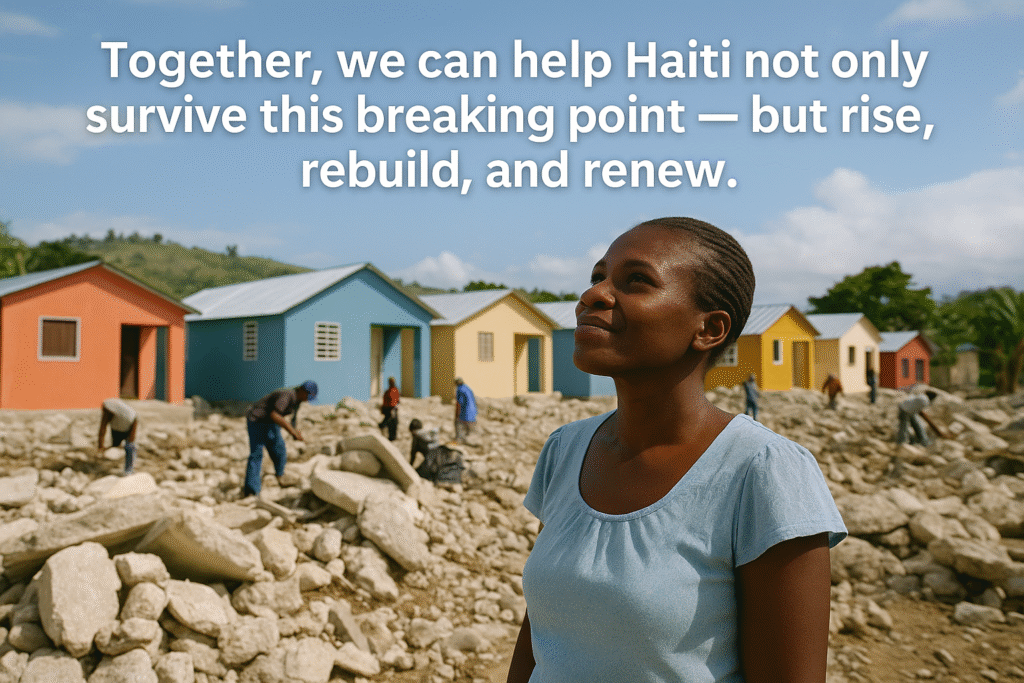 Every contribution is a lifeline. Every partnership, a promise. Together, we can help Haiti not only to survive this breaking point — but to rise, rebuilt and renewed.